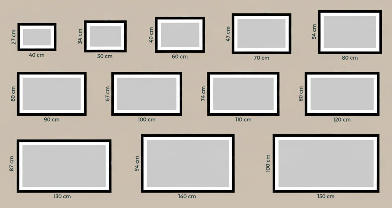 Todas as obras das coleções exibidas nas galerias do site também podem ser adquiridas em tamanhos padrão conforme a tabela e opções de moldura abaixo.
